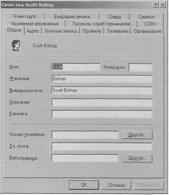 • Вкладка Общие (General): свойства Описание (Description), Комната (Office), Номер телефона (Telephone Number), Факс (Fax), Веб-страница (Web Page), Адрес электронной почты (E_mail).