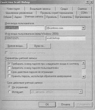 Некоторые из этих свойств описаны в таблице 2. Они были настроены при создании объекта пользователя, и их, как и большой набор других свойств учетной записи, можно изменить на вкладке Учетная запись (Account). Значения некоторых свойств не совсем очевидны, они описаны в таблице 3.