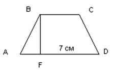 3. № 000. Дана равнобедренная трапеция АВСD. Перпендикуляр, опущенный из вершины В на большее основание AD делит это основание на два отрезка, больший из которых равен 7 см. Найдите среднюю линию трапеции.