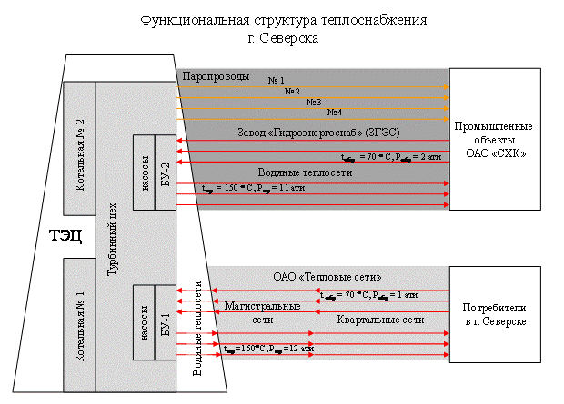 9. Тепловые сети выполнены двухтрубными в сочетании с подающими трубопроводами для подачи горячей воды от ТЭЦ до систем теплоиспользования и обратными трубопроводами для возврата охлажденной в системе воды к ТЭЦ для повторного подогрева. Подающие и обратные трубопроводы водяной тепловой сети вместе с соответствующими трубопроводами ТЭЦ и систем теплоиспользования образуют замкнутые контуры циркуляции воды. Эта циркуляция поддерживается сетевыми насосами ТЭЦ и насосными станциями на тепловых сетях. На обслуживании завода «Гидроэнергоснаб» находятся все сети, обеспечивающие теплоснабжение объектов . Обслуживание магистральных и квартальных тепловых сетей до вводов в здания г. Северска обеспечивается .