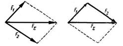 Правило параллелограмма - равнодействующая (FΣ) двух сил (F1 и F2), приложенных к одной точке, является диагональю параллелограмма, построенного на данных силах (рис. 1.3, а). Вместо правила параллелограмма можно пользоваться правилом треугольника (рис. 1.3, б).