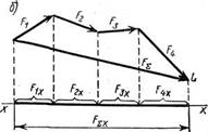 Задана система сходящихся сил F1, F2, F3, F4 (рис. 2.5, а). Построим силовой многоугольник и опустим из вершин силового многоугольника на ось х перпендикуляры (рис. 2.5, б).