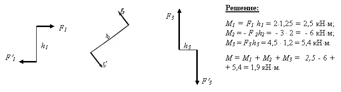 Пример 3.1. Определить момент результирующей пары, эквивалентной системе трех пар, лежащих в одной плоскости (рис. 3.2). Первая пара F1 = F¢1 = 2 кН, плечо h1 = 1,25 м; вторая пара F2 = F¢2 = 3 кН, плечо h 2 = 2 м; третья пара F3 = F¢3 = 4,5 кН, плечо h3 = 1,2 м.