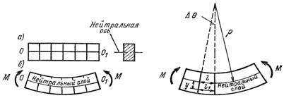 При изгибе продольные волокна балки на выпуклой стороне удлиняются, а на вогнутой укорачиваются (рис.12.1). Слой волокон, лежащих на половине высоты балки, сохраняет, искривившись, неизменную длину. (рис. 12.2).