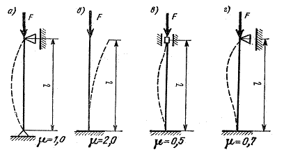Приведенная длина стержня lпр - длина стержня при различных способах закрепления его канцов, приведенная к длине стержня, закрепленного с обоих концов шарнирами.