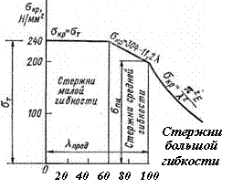 На рис. 13.3 приведен график, характеризующий зависимость критического напряжения от гибкости для стержней из стали СтЗ.