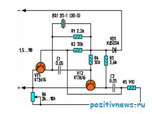 Диод VD1 необходим для защиты от неправильного подключения питания к схеме. Питается устройство от гальванических элементов +1,5 В (напряжение питания можно повышать до +9 В). С увеличением напряжения возрастает мощность излучения устройства. Звуковоспроизводящим элементом устройства служит пьезоизлучатель ЗП-1 (ЗП-3, ЗП-22). Резисторы R2...R4 и R5, R6 задают рабочую точку транзистора VT1 и VT2. При подаче напряжения на VT1 заряжается С1, импульс с С1 кратковременно открывает VT2, VT2 заряжает С2, который кратковременно открывает VT1, и цикл работы повторяется снова. Частота генератора зависит от величин емкостей С1 и С2 и сопротивления R6. Можно последовательно с BQ1 включить еще несколько излучателей, тогда выходная мощность увеличится.