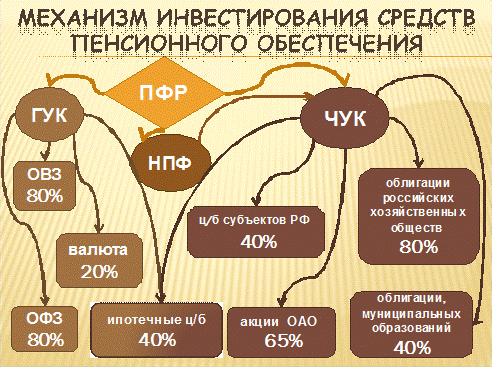 ГУК имеет право вкладывать свои активы в государственные ЦБ РФ, денежные средства в рублях и иностранной валюте на счетах кредитных организаций, ипотечные ценные бумаги, выпущенные в соответствии с законодательством РФ. Перечень активов ЧУК и НПФ больше, чем ГУК. Кроме перечисленных активов, ЧУК могут инвестировать средства в государственные ценные бумаги субъектов РФ, облигации и акции российских эмитентов, созданных в форме ОАО, в паи (акции, доли) индексных инвестиционных фондов и др. НПФ имеет право размещение пенсионных резервов в ценные бумаги, не имеющие признаваемых котировок; в банковские вклады и недвижимость; в ценные бумаги, выпущенные учредителями и вкладчиками фонда; в векселя; в ОФЗ; в ценные бумаги