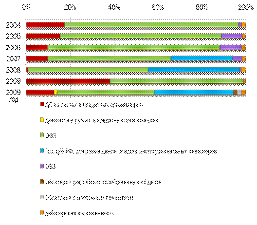 1. Структура инвестиционного портфеля ВЭБ (ГУК) претерпела существенные изменения. Доля ОФЗ сократилась практически в два раза - с 80% в 2004г до 22% в 2009г., в 2008г. наконец исчезли ОВЗ, растет доля государственных ценных бумаг РФ для размещения средств институциональных инвесторов. ГУК инвестирует пенсионные накопления в основном в государственные ценные бумаги