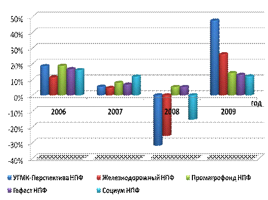 2. Что касается НПФ, то их количество сократилось за период на 43% - с 296 до 170, при том, что число людей, получающих негосударственную пенсию, выросло с 0,5 млн. чел. до 1,2 млн. чел. Наращивать ресурсную базу системе НПФ приходится в условиях мирового финансового кризиса. У части НПФ были отозваны лицензии, часть объединила свои капиталы. Размеры привлеченных в пенсионную систему пенсионных ресурсов растут опережающими темпами по отношению к размерам имущества для осуществления уставной деятельности НПФ. Сумма пенсионных накоплений по НПФ в целом увеличилась с 1,1 млрд. руб. В 2004 до 71, 7 млрд. руб. в 2009г. В три с лишним раза увеличились пенсионные резервы и составили в 2009г. 518 млрд. руб. НПФ размещают средства в основном в акции и облигации. Для того чтобы проследить изменения доходности от инвестирования пенсионных накоплений НПФ, была сделана выборка из числа НПФ среднего уровня концентрации капитала (рис.2).
