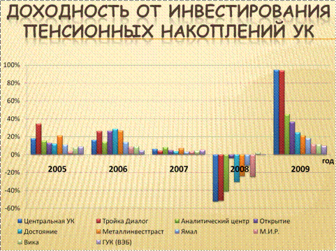 Наиболее удачными годами для инвестирования были гг. Те застрахованные, которые выбрали управляющие компании с доходностью более 20%, получили прирост своих накопительных пенсионных средств в размере от 10% до 25%. В 2008г. по большинству НПФ наблюдались убытки. По выборке только два из пяти НПФ заявили прибыль в 2008г, и оба имели достаточно консервативную структуру инвестиций. В соответствии с законодательством, обанкротившиеся НПФ передают свои ресурсы в ПФР.
