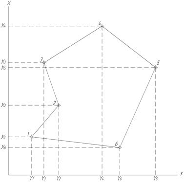 Если участок представляет собой простейшую геометрическую фигуру (треугольник, трапецию и др.), то площадь его вычисляют по общеизвестным формулам геометрии или тригонометрии [4,5]. Площади многоугольников вычисляют обычно по координатам вершин (рис. 1).