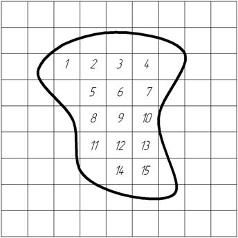 Для определения площади палетку накладывают на замкнутый контур (рис.3). Площадь подсчитывается как сумма полных и неполных квадратов. Недостаток графического способа заключается в том, что количество неполных квадратов приходится оценивать на глаз. На рисунке 3 число полных квадратов 15, а неполных примерно равно 8,5 для каждого неполного квадрата глазомерно определяют, какую часть он составляет от полного. Следовательно, отсюда относительная ошибка определения площади палеткой составляет 1/100.