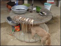 Питались мы, соответственно, тоже вместе с аборигенами. Преимущественно – это рис и какая-то вареная трава, на завтрак – лапша (бомж-пакет) иногда яйцо, кроме того, каждый вечер для нас готовили курицу. Но куры тут исключительно спортивные, так что самое ценное от них – это бульон и запах… Кроме того, всегда подавался какой-то невдолбенно-острый соус (они там вообще любят острую пищу). Самым запоминающимся деликатесом, которым нас угощали, стал некий соус, серо-бело-коричневого цвета, со странным запахом. При более пристальном изучении в нем были обнаружены лапки каких-то жуков, а Оло (наш гид) жизнерадостно поведал, что эта «вкуснятина» готовится из головастиков и риса. Еще один местный деликатес – печеная бамбуковая крыса. С виду она очень похожа на нашу обыкновенную помоечную… (Очень противоречивые чувства вызывает вид милой девушки, модно наряженной, с гламурным розовым кошелечком расшитом стразами, деловито копающейся в трупиках этих самых крыс, и по состоянию хвостиков определяющей какая из них посвежее. Этакий романтический ужин на двоих…). Сахар здесь – редкость, шоколада просто нет и, похоже, никогда не было… Зато, в северном Лаосе, за все время пребывания мы не встретили НИ ОДНОГО мало-мальски толстого человека! А ведь мы посетили не меньше десятка деревень…