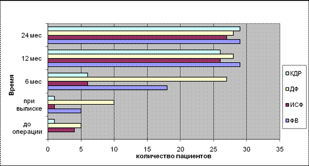 Восстановление геометрических показателей ЛЖ происходило медленнее, но в целом в 26% случаев наблюдений отмечено через 6 месяцев после операции, в 87% через 12 месяцев и в 97% через 24 месяца. Средние значения эхокардографических показателей через 6, 12 и 24 месяца представлены в таблице 4 и рисунке 1.