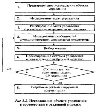 Иногда процесс исследования конкретного объекта производится в соответствии с выбранной (рекомендуемой) моделью системы управления, часто называемой эталоном. Этапы проведения исследования в соответствии с эталонной моделью представлены на рис. 3.2.