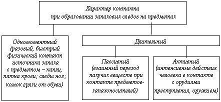 При образовании запаховых следов человека на объектах большое значение имеют продолжительность контакта и время, прошедшее с момента следообразования до момента отбора запаховых проб или консервации предметов. Характер материала объектов-следоносителей не оказывает особого влияния на образование запаховых следов и на возможность идентификационного исследования.