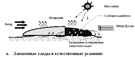 Механизм образования запаховых следов человека на предметах (объектах) включает различные физические процессы (рис. 1). Один из них – механическое обтирание, отслоение фрагментов запахового следа, частиц эпидермиса, волос при контактном взаимодействии источника-запахоносителя с различными предметами. Такое дискретное следообразование одномоментно или протекает в короткий промежуток времени, при котором пахучие вещества одноразово переносятся с источника на следовоспринимающий объект (дорожка следов ног на почве, брызги, пятна крови на одежде и других предметах). Количественная характеристика таких следов определяется не сроком их образования, а периодом накопления пахучих веществ источником – следообразователем (длительность носки обуви, которой оставлены следы, сила кровотечения, степень загрязнения кожных покровов или волос человека).