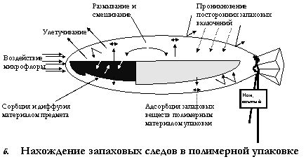 Однако криминалистическое использование пахучих образований, находящихся в воздухе, крайне ограничено. Они существуют лишь в течение считанных минут, а затем рассеиваются в пространстве. В этой связи нелишне подчеркнуть, что запаховые следы, собранные шприцами, флягами, полиэтиленовыми пакетами из воздуха (такие приемы предлагались на ранних этапах работы с запаховыми следами [1, 4]), для идентификации субъекта не пригодны. Это связано с тем, что считанные молекулы подобных запаховых следов (в основной своей массе) рассеиваются, сдуваются ветром и частично осаждаются на окружающих предметах еще до прибытия следственно-оперативной группы. Отбор запаховых проб непосредственно из воздуха и сохранение их для последующего исследования оказались неэффективными и в настоящее время не используются.