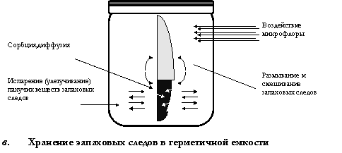 Специалисты ЭКЦ МВД России в 1998 г. провели эксперимент по изучению процесса перехода запаховых следов с одного предмета на другой в условиях их совместного хранения.