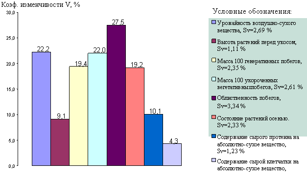 Значительная вариабельность отмечена для некоторых элементов структуры кормовой продуктивности, урожайности воздушно-сухого вещества и семян (рисунок 2).