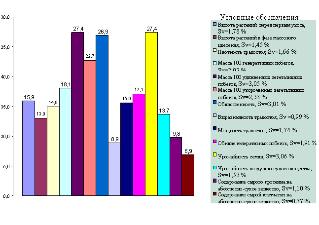 Рисунок 2 - Коэффициент вариации (V %) признаков, определяющих кормовую и семенную продуктивность селекционных образцов овсяницы тростниковой в сплошном травостое, гг. (Sv – ошибка коэффициента вариации, %)