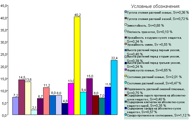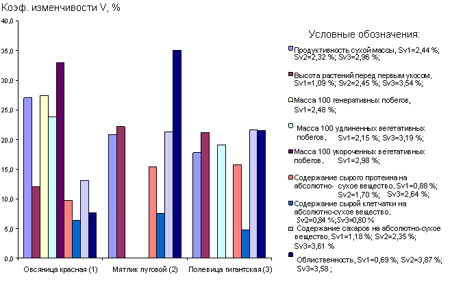 На основании анализа статистических характеристик кормовой продуктивности исходных индуцированных полиплоидов и отдаленных гибридов Festulolium на ранних этапах ( гг.) установлен очень высокий уровень изменчивости признаков, что способствовало широкому внутрипопуляционному отбору. На заключительных этапах ( гг.) наблюдались незначительная или средняя вариабельность большинства морфологических, хозяйственных признаков и свойств, связанных с урожайностью кормовой массы и семян (рисунок 3).