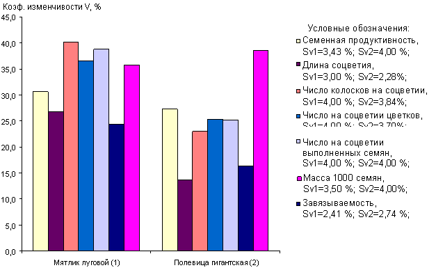 Рисунок 5 - Коэффициент изменчивости (V%) признаков, определяющих семенную продуктивность исходных образцов многолетних низовых злаковых трав, гг. (Sv1 – ошибка коэффициента вариации признака для мятлика лугового, %; Sv2 - для полевицы гигантской, %)