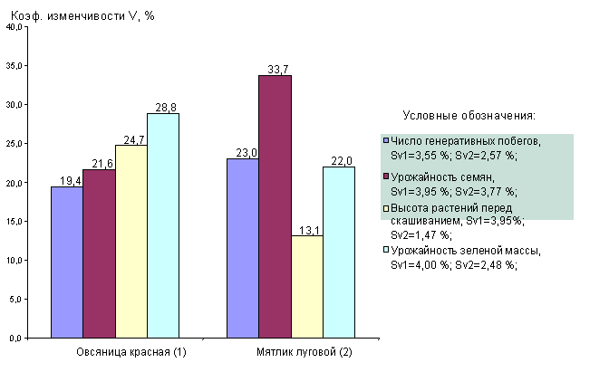 Рисунок 6 - Коэффициент изменчивости (V%) хозяйственных признаков урожайности кормовой массы и семян внутривидовых гибридов многолетних низовых злаковых трав, гг. (Sv1 – ошибка коэффициента вариации признака для овсяницы красной, %; Sv2 –для мятлика лугового, %)