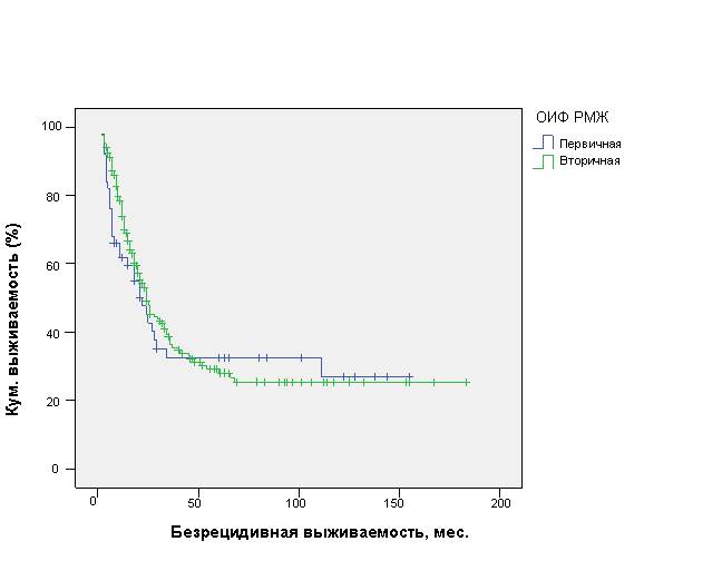 Рис. 1. Безрецидивная выживаемость больных первичной и вторичной ОИФ РМЖ.