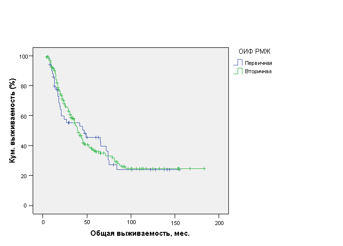Рис. 2. Общая выживаемость больных первичной и вторичной ОИФ РМЖ