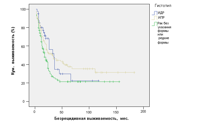 Статистически значимые различия в кривых БРВ наблюдались в зависимости от гистологического строения опухоли. При ИПР (n=105) средняя БРВ составила 75,5±8,9 мес. (ДИ 95%, 58,1-92,9 мес.) с медианой 33±8,9 мес. и была достоверно лучше, чем при ИДР (n=,4±8,0 мес. (ДИ 95%, 31,7-63,2 мес.) с медианой 35±4,4 мес. и при редких формах рака и раке без указания формы (n=1,6±6,3 мес. (ДИ 95%, 33,3-57,8 мес.) с медианой 18±2,1 мес. (р=0,013) (рис. 3).