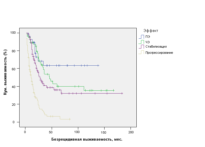 Эффект от лечения является признанным фактором, определяющим прогноз РМЖ. Поэтому он также был включен в проведенный анализ. Установлено, что у больных с полным эффектом (ПЭ) (n=28) средняя БРВ составила 94,3±11,8 мес. (ДИ 95%, 71,3-117,3 мес.), медиана не достигнута, у больных с частичным эффектом (ЧЭ) (n=57) – 81,4±10,3 мес. (ДИ 95%, 61,1-101,6 мес.) с медианой 46±8,6 мес., у больных со стабилизацией (n=84) – 74,4±10,4 мес. (ДИ 95%, 54,1-94,7 мес.) с медианой 28±4,3 мес. по сравнению с 17,1±2,1 мес. (ДИ 95%, 13,0-21,2 мес.) с медианой 11±1,5 мес. у больных с прогрессированием (n=95) (р=0,0001) (рис. 4).