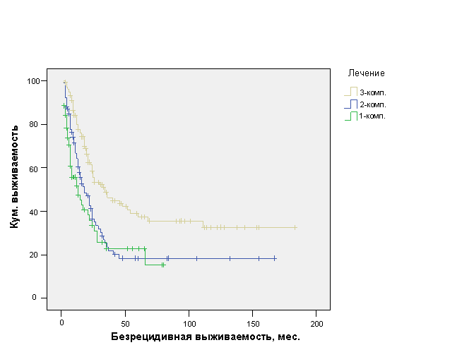 Рис. 5. Безрецидивная выживаемость больных ОИФ РМЖ в зависимости от компонентности (комплексности) лечения.