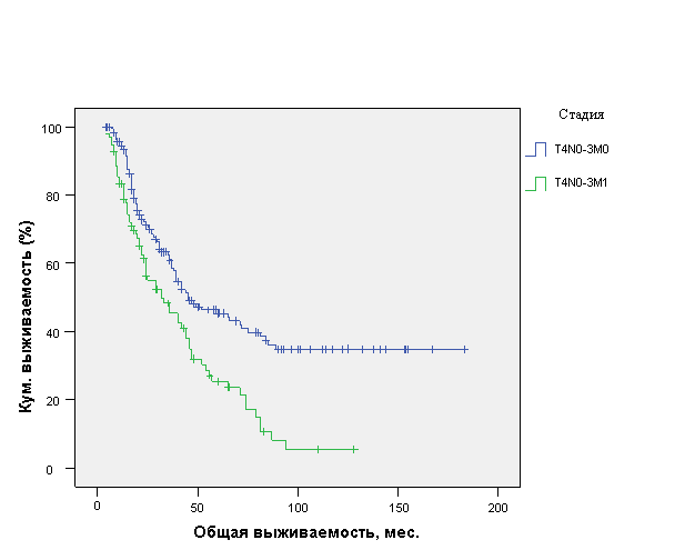 Правильная постановка стадии заболевания имеет принципиальное значение для прогноза ОИФ РМЖ. В частности, ОВ у пациенток с T4N0-3M0 (n=168) составила 86,3±6,6 мес. (ДИ 95%, 73,4-99,1 мес.) с медианой 45±8,5 мес., тогда как у пациенток с T4N0-3M1 (n=96) - только 42,1±3,8 мес. (ДИ 95%, 34,6-49,5 мес.) с медианой 32±6,3 мес. (р=0,001) (рис. 6).