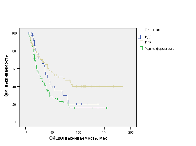 Как видно из рис. 7, ИПР характеризуется достоверно лучшей ОВ по сравнению с ИДР и редкими формами рака, что позволяет отнести гистологическое строение опухоли к факторам прогноза ОВ больных ОИФ РМЖ.