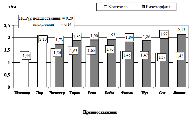 Таким образом, при использовании биопрепаратов на основе клубеньковых бактерий роль зернобобовых культур в севообороте существенно усиливается. При небольших затратах инокуляция обеспечивает существенный прирост урожая не только зернобобовой, но и следующей за ней зерновой культуры. Суммарный эффект ризоторфина с учетом действия и последействия составляет в среднем 0,5-0,6 т/га зерна при выращивании традиционных и 0,8-1,2 т/га – при возделывании новых для региона зернобобовых культур.