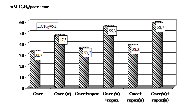 Аналогичные результаты получены в другом опыте, где при инокуляции овса азотфиксирующая активность возросла на 45 % в одновидовом посеве и на 55 % в смеси с горохом (рис. 9).