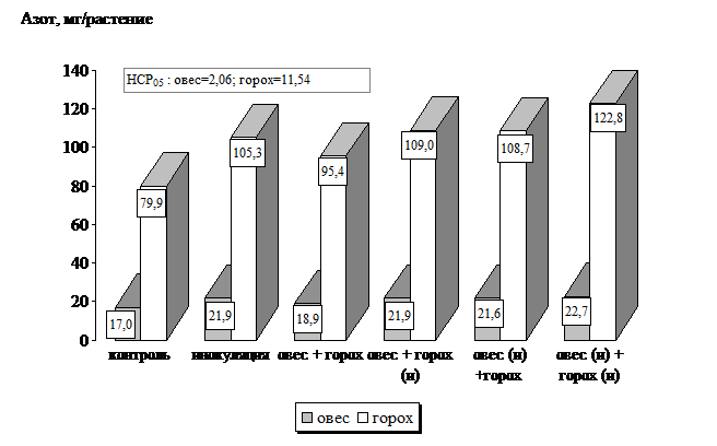 Потребление азота (мг/растение) в значительной степени определяется азотфиксирующей активностью бактерий в ризосфере овса (r = 0,82±0,30) и клубеньках гороха (r = 0,80±0,32).
