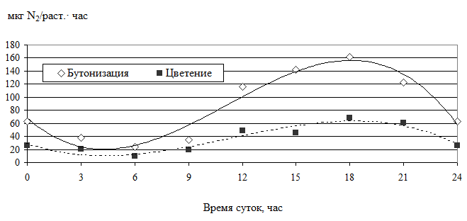 Экспериментальные данные показывают, что нитрогеназная активность клубеньковых бактерий в течение суток существенно меняется. Так у гороха максимальные и минимальные значения различаются в 5-8 раз, особенно в период бутонизации растений (рис.11).