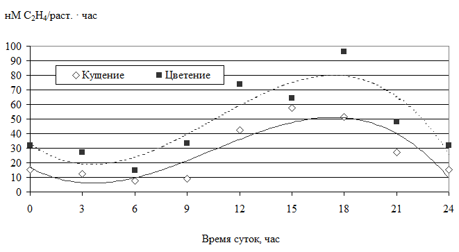 Самые низкие показатели азотфиксирующей активности, как в фазу кущения, так и в фазу цветения были отмечены в 6 часов утра. Затем идет нарастание скорости процесса, достигая максимума в 15 (кущение) или в 18 (цветение) часов.