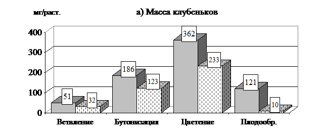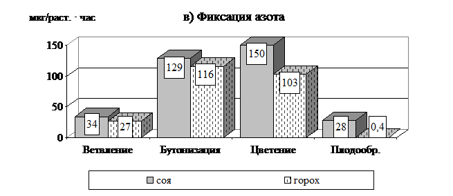 Активность нитрогеназы клубеньковых бактерий гороха имеет в целом схожую сезонную динамику, но максимальные значения показателя приходятся на фазу бутонизации (рис. 13б). А в период от бутонизации до цветения, несмотря на продолжающийся прирост массы клубеньков, их удельная азотфиксирующая активность уже идет на убыль. По-видимому, это связано со снижением обеспеченности клубеньковых бактерий энергетическим материалом из-за перераспределения продуктов фотосинтеза в пользу генеративных органов растения. При этом установлены существенные различия между изучаемыми культурами. Так, если у гороха активность клубеньков снижается в среднем в 2 раза, то у сои только на 42 %. Это приводит к тому, что азотфиксирующая продуктивность в расчете на растение у гороха к цветению уже падает, а у сои в этот период наблюдаются максимальные значения показателя (рис. 13в).