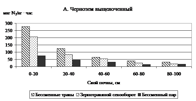 При возделывании растений потенциал азотфиксации чернозема в 2,0-2,3 раза выше, чем каштановой почвы. Длительное парование, сводящее до минимума поступление в почву свежего органического вещества, нивелирует эти различия. Следовательно, в постоянно парующейся почве происходят необратимые изменения в количественном и качественном составе диазотрофов, которые не позволяют даже при обеспечении бактерий достаточным питанием поднять азотфиксирующую активность до уровня почвы, на которой выращиваются однолетние полевые культуры.