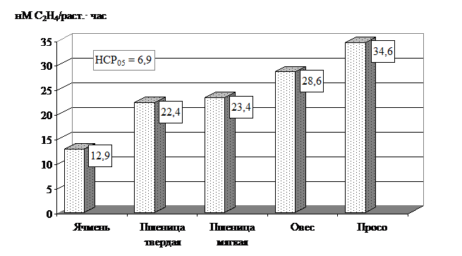 Так, по годам исследований средние показатели нитрогеназной активности в фазу цветения у ячменя изменялись от 9,4 до 17,1, у твердой пшеницы – от 15,5 до 28,1, у мягкой пшеницы – от 16,0 до 34,7, у овса – от 15,0 до 39,5, и у проса – от 21,0 до 46,7 нМ С2Н4/раст. · час. При этом минимальные (ячмень) и максимальные (просо) характеристики в среднем различались в 2,7 раза В результате анализа показателей нитрогеназной активности у различных сортов также выявлены существенные различия. В частности, у твердой пшеницы во все годы исследований самый низкий уровень азотфиксации отмечался у сорта Алтайка, а максимальная активность – у сортов Гордеиформе 53 и Зарница Алтая, которые в среднем за 3 года превосходили сорт Алтайка в 1,6-1,7 раза.