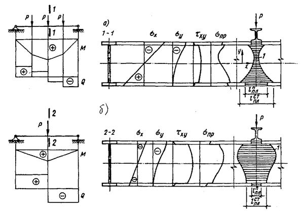В стенках двутавровых балок вблизи приложения поперечной нагрузки
