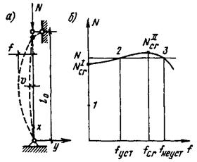 Поведение стержня под нагрузкой характеризуется графиком (рис.2.4,б), где вначале с ростом нагрузки стержень сохраняет прямолинейную форму, с дальнейшим ростом нагрузки, когда