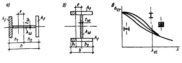 плоскости полок; в – зависимость критических напряжений от гибкости