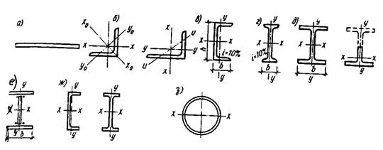 Двутавры – основной балочный профиль – имеют наибольшее разнообразие по типам (см. рис. 3.1,г-ж), которые соответствуют определенным областям применения.