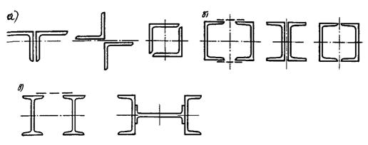 Стержни из швеллеров, работающие на осевую силу, компонуются в жесткие относительно осей x и y симметричные сечения (рис. 3.2,б).