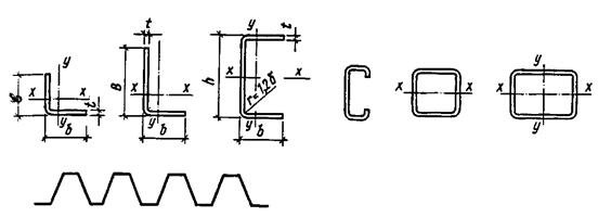 Гнутые профили изготовляются из листа, ленты или полосы толщиной от 1 до 8 мм и могут иметь самую разнообразную форму (рис. 3.3). Наиболее употребительны уголки равнополочные (ГОСТ ), неравнополочные (ГОСТ ), швеллеры (ГОСТ 8278-83), гнуто-сварные профили замкнутые квадратного (ТУ ) и прямоугольного (ТУ